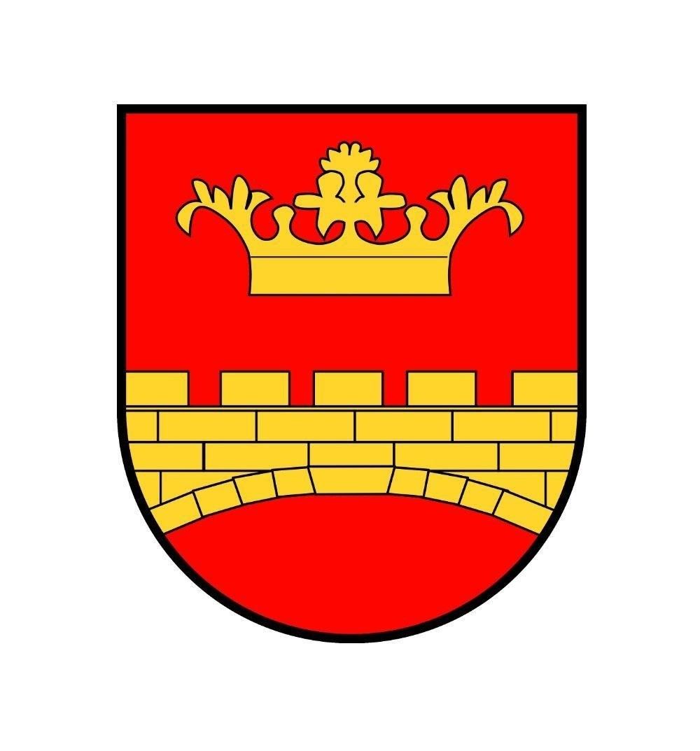„In rotem Schild eine goldene, gefugte und mit fünf Zinnen versehene Brücke, überhöht von einer goldenen Blätterkrone.“
